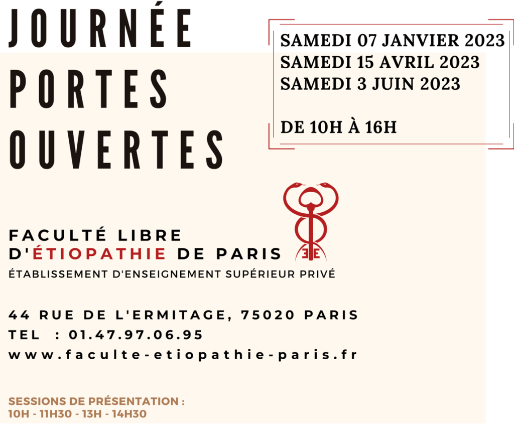 Journée Portes Ouvertes à la Faculté Libre d'Étiopathie de Paris La Faculté Libre d'Étiopathie de Paris a le plaisir d'annoncer…